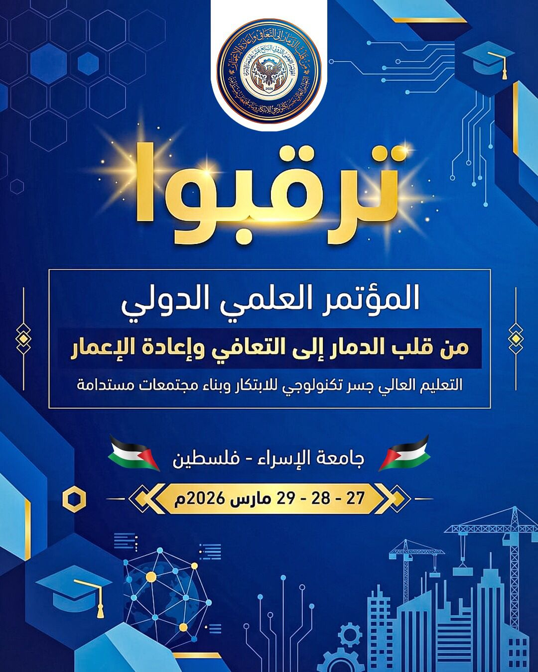 تتواصل الاستعدادات النهائية لانطلاق المؤتمر العلمي الدولي السابع عشر، الذي تنظمه جامعة الإسراء – فلسطين تحت عنوان : "من قلب الدمار إلى التعافي وإعادة الإعمار: التعليم العالي جسر تكنولوجي للابتكار وبناء مجتمعات مستدامة"، والمقرر عقده أيام 27 و28 و29مارس/آذار 2026، بمشاركة وجاهية وإلكترونية، في ظل ظروف استثنائية تمر بها المنطقة.