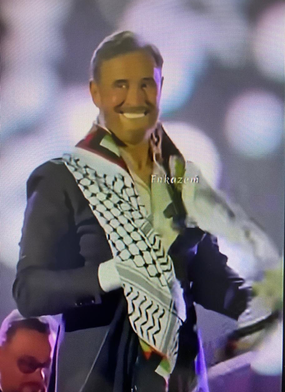 وفي مشهد رمزي أثار إعجاب الحاضرين، تلقى الساهر كوفية فلسطينية مزينة بعلم فلسطين من أحد أفراد الجمهور، فوضعها على كتفيه وسط تصفيق حار وهتافات مؤيدة، قبل أن يواصل أداءه الفني، في لفتة اعتبرها كثيرون تعبيرًا عن تضامن الفنان مع القضية الفلسطينية.